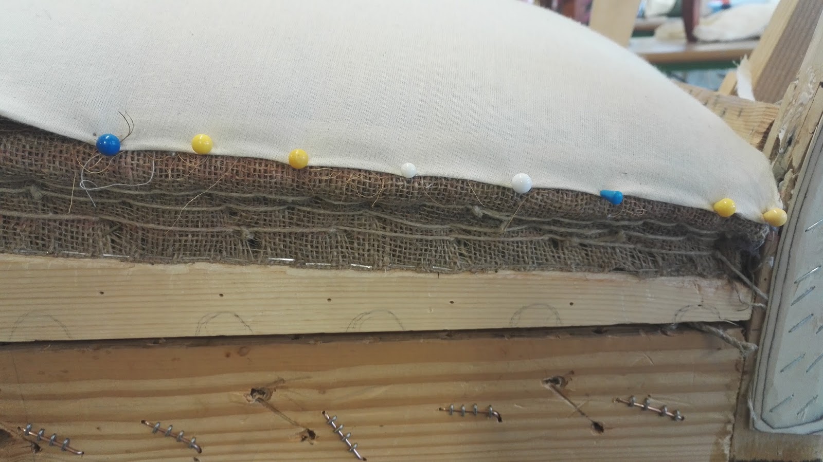 Kun täyte oli levitetty tasaisesti, laitoin istuimen päälle lakanakankaan, jonka pujotin takasarjan alle ja kiristin heftiin edestä ja sivuilta. Lakanakankaan ompelin piilotikein kiinni istuinosaan.